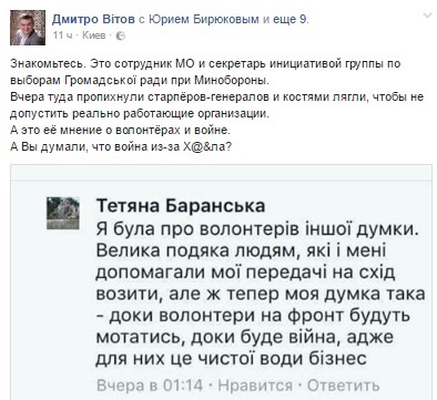 Баранская написала в Facebook, что для волонтеров война - это бизнес.