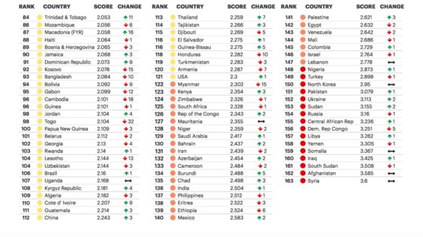 В тройку самых безопасных стран вошли Исландия, Новая Зеландия и Австрия. Самой опасной страной организация назвала Сирию, которая заняла 163 место. Россия на 154 месте в рейтинге.