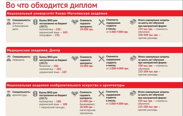 Стоимость обучения на контрактной форме в год — от скромных 12-15 тыс. грн в региональных университетах до весомых 50-55 тыс. грн на престижных факультетах столичных вузов. И если 1 тыс. грн в месяц за образование могут себе позволить многие, то 4-5 тыс. грн будут более ощутимы для семейного бюджета. Но и они не выглядят катастрофически недоступными.